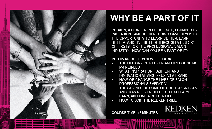 REDKEN, A PIONEER IN PH SCIENCE, FOUNDED BY PAULA KENT AND JHERI REDDING GAVE STYLISTS THE OPPORTUNITY TO LEARN BETTER, EARN BETTER, AND LIVE BETTER THROUGH A HISTORY OF FIRSTS FOR THE PROFESSIONAL SALON INDUSTRY. HOW CAN YOU BE A PART OF IT?